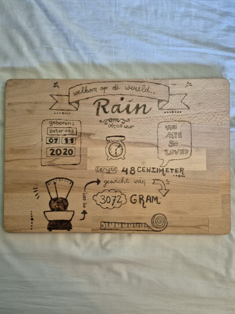 Op zoek naar een cadeau? Ook dan bent u bij mij aan het juiste adres. Ik heb verschillende mogelijkheden. Van een naambordje met tekening van uw paard, tot een portret van uw (klein) kinderen of huisdieren, of liever een snijplank met ingebrand Disneyfiguur, de keuze is reuze en ik kijk graag met u mee voor een leuk, persoonlijk cadeau.